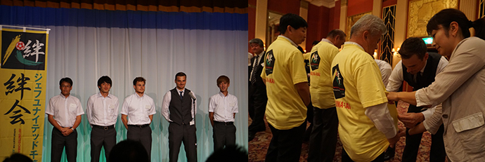 総会後の交流会には、ジェフユナイテッド千葉の関塚隆監督、大岩一貴選手、パウリーニョ選手、ネイツ選手、中村太亮選手が参加くださり、今年のジェフユナイテッド千葉絆会の会員限定グッズオリジナルTシャツへのサインや写真撮影に応じ、会員のみなさまとの交流をはかりました。